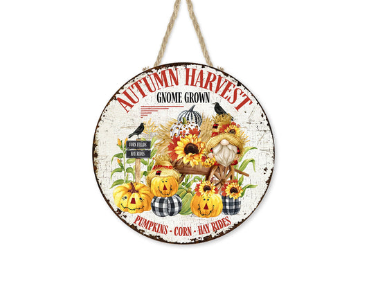 Corona de gnomo de cosecha de otoño, colgador de puerta con letrero de madera hecho a mano impreso redondo de otoño