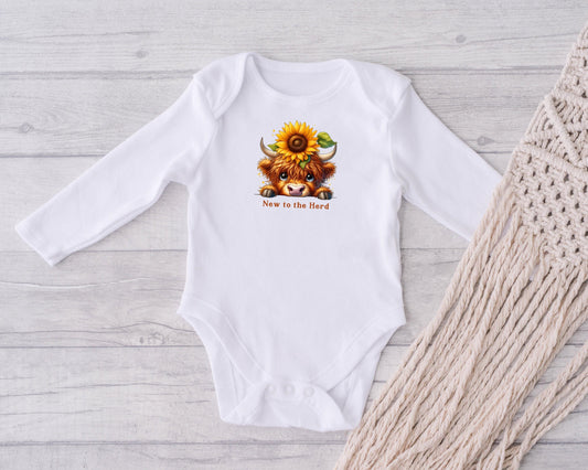 Baby Bodysuit, New to the Herd Highland Cow One Piece Baby Suit, Baby Gift, Long / Short Sleeve, 0-18 Months size