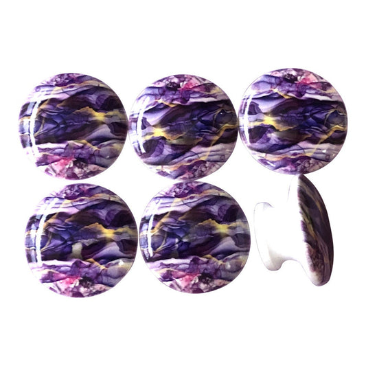Conjunto de 6 perillas de gabinete de madera con patrón de remolino de tinta púrpura, perillas de gabinete y tiradores de dibujo, perillas de cocina, decoración de habitación para niñas, decoración moderna