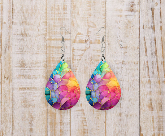 Pendientes estampados con diseño de lágrima y diseño de vidrieras de arcoíris, hechos a mano