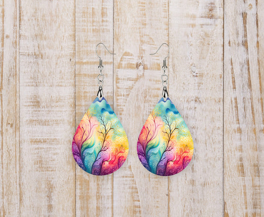 Pendientes estampados con diseño de lágrima y diseño de vides de arcoíris, hechos a mano