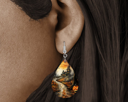 New Releases Fall Halloween Earrings Haunted Path Print Tear Drop Wood Dangle Earrings Hypoallergenic Jewelry