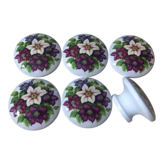 Cabinet Knobs, Drawer Knobs, Set of 6 Clementis Flowers Print Wood Cabinet Knobs, Floral Cabinet Knobs and Drawer Pulls