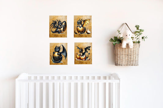 Set of 4 8x10 Black and Gold Dragons Wall Art, Canvas Prints, Contemporary Wall Art