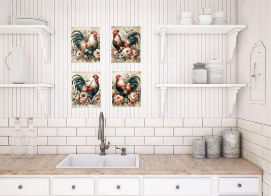Set of 4 8x10 Floral Rooster Wall Art, Canvas Prints, Contemporary Wall Art