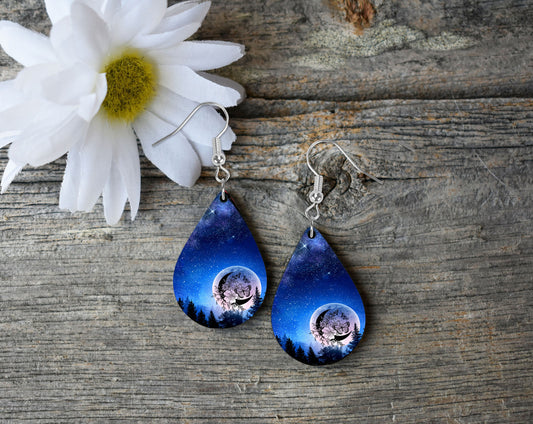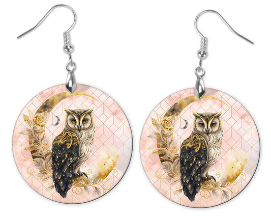 Celestial Owl on Moon Round Printed Wood Earrings Jewelry