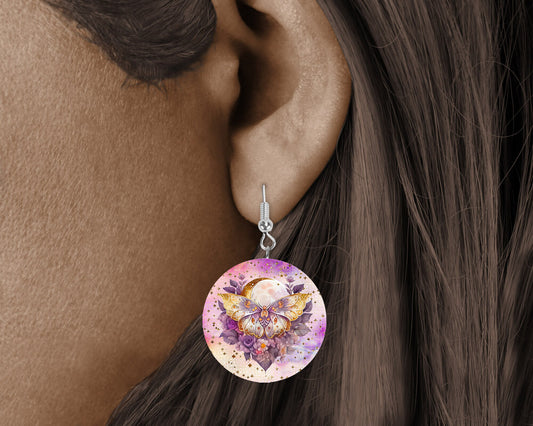 Mystical Moth Round Printed Wood Earrings Jewelry
