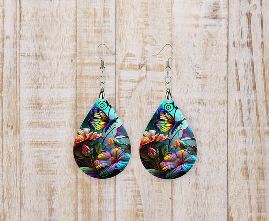 Butterfly and Flowers Tear Drop Dangle Printed Earrings Jewelry Handmade