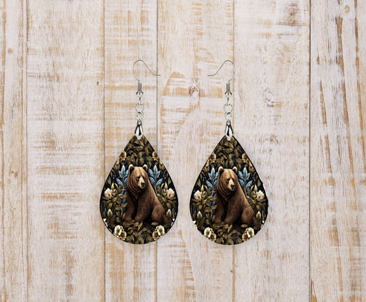 New Release Bear in Flowers, Tear Drop Dangle Printed Earrings Jewelry Handmade