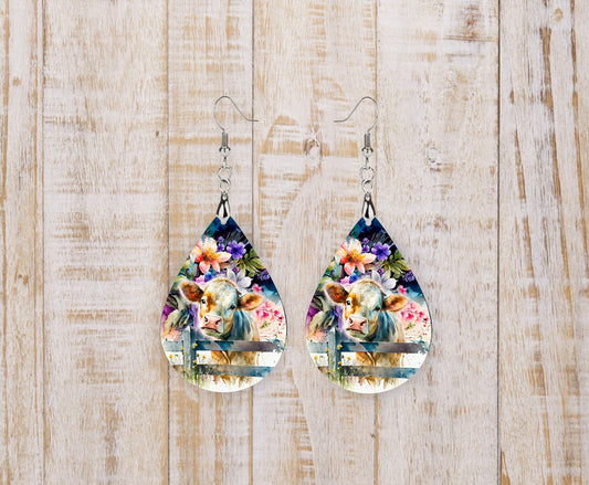 New Release Cute Cow at Fence, Tear Drop Dangle Printed Earrings Jewelry Handmade