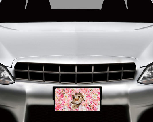 Cat Peeking from Flowers Aluminum Vanity License Plate Car Accessory Decorative Front Plate