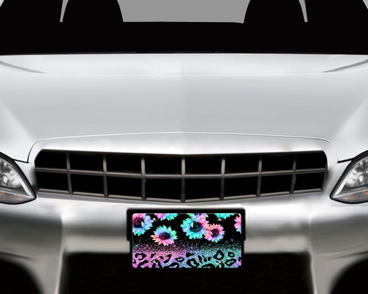 Daisy and Leopard Print Rainbow Aluminum Vanity License Plate Car Accessory Decorative Front Plate