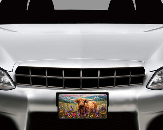New Release Highland Cow in Wildflowers Printed Aluminum Front License Plate, Car Accessory, Vanity Plate, Cute Car Tag