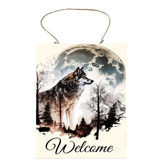 Western Welcome Sign, Welcome Full Moon Wolf Hanging Wall Sign Wood Home Decor, Door Hanger, Wreath Sign