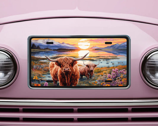 Vanity Front License Plate, Highland Cow Sunset Aluminum License Plate Car Accessory Decorative Front Plate