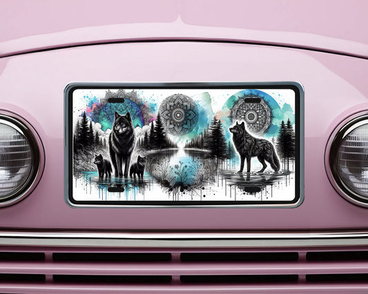 Vanity Front License Plate, Black Wolf Mandala Aluminum Vanity License Plate Car Accessory Decorative Front Plate