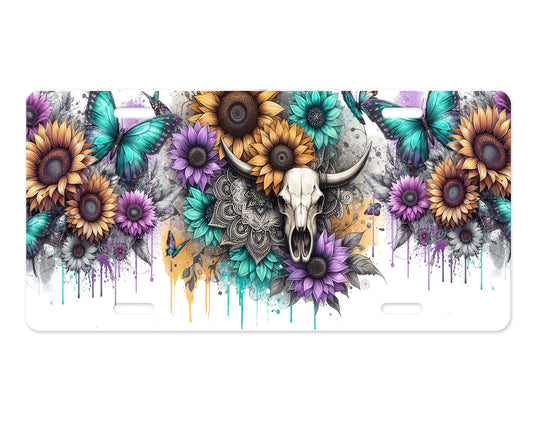 Vanity Front License Plate, Cow Skull and Sunflowers Aluminum Vanity License Plate Car Accessory Decorative Front Plate