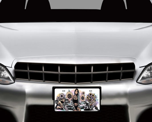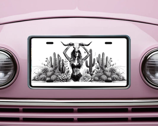 Vanity Front License Plate Gray Scale Girl and Cactus Aluminum Vanity License Plate Car Accessory Decorative Front Plate