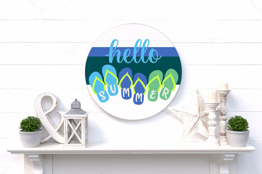 Hello Summer Flip Flops Round Printed Handmade Wood Sign