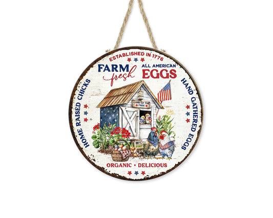 Letrero de madera hecho a mano con estampado redondo de All American Fresh Eggs, colgador de puerta, letrero de corona