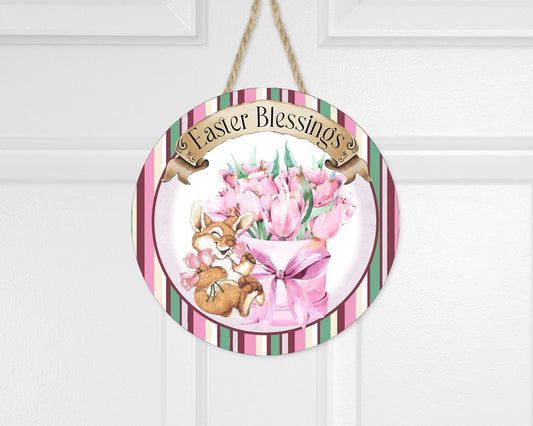 Colgador de puerta con letrero de madera hecho a mano con estampado redondo de conejito de bendiciones de Pascua