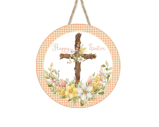 Colgador de puerta con letrero de madera hecho a mano impreso redondo con cruz de Feliz Pascua