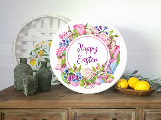 Guirnalda floral de Pascua feliz, colgador de puerta con letrero de madera hecho a mano impreso redondo