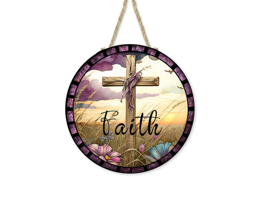 Letrero de madera hecho a mano con estampado redondo de cruz de fe, colgador de puerta de granja, letrero de corona