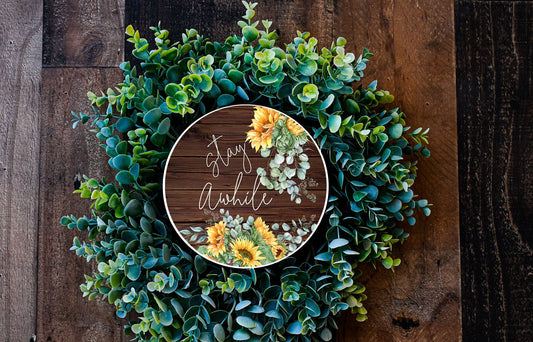 Sunflower Stay Awhile Round Printed Handmade Wood Sign