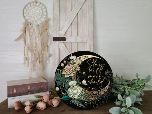 Stay Wild Moon Child Round Hanging Wall Sign Wood Home Decor, Hippie Decor, Door Hanger, Wreath Sign