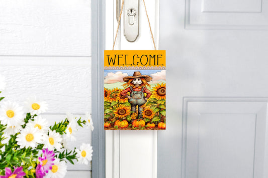 Fall Decor, Fall Sign, Sunflower Fields Scarecrow Welcome Farmhouse Decor Printed Handmade Wood Sign Door Hanger Sign
