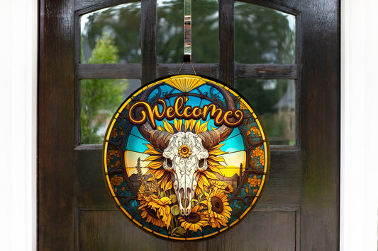 Western Welcome Sign, Faux Stain Glass Cow Skull and Sunflowers Round Wood Sign Farmhouse Door Hanger Wreath Sign, Western Decor