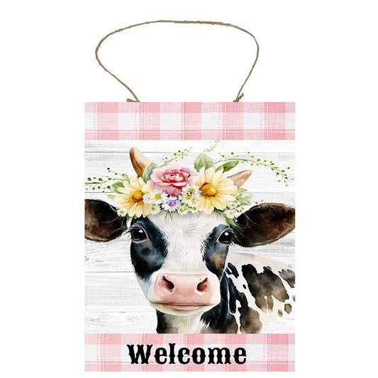 Wall Decor, Welcome Sign, Welcome Cow Pink Plaid Farmhouse Decor Printed Handmade Wood Sign Door Hanger Sign