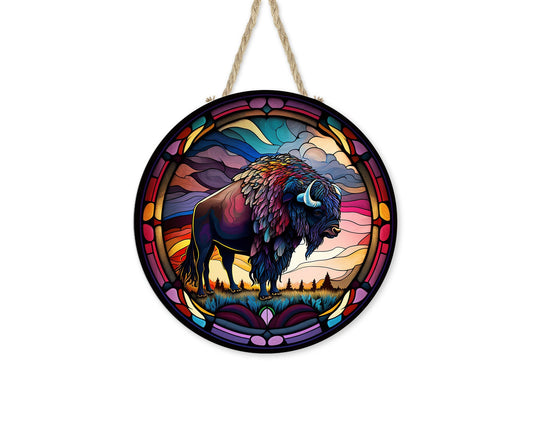 Western Welcome Sign, Faux Stain Glass Buffalo Welcome Round Printed Wood Sign Farmhouse Door Hanger Wreath Sign, Western Decor