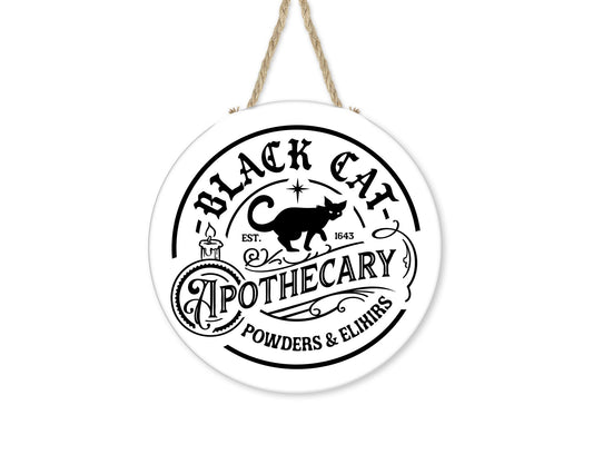 Black Cat Apothecary Wreath Sign Halloween Round Printed Handmade Wood Sign Door Hanger