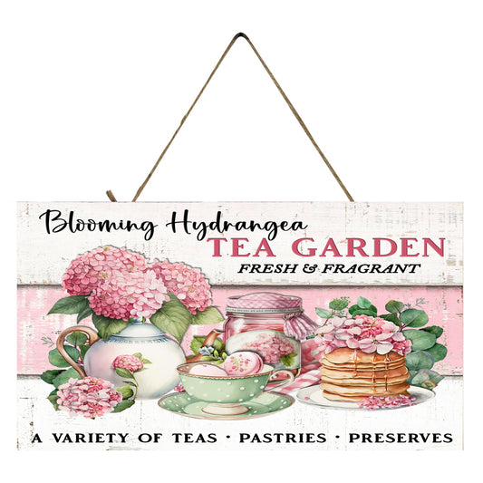 Blooming Hydrangea Tea Garden Twisted R Design Farmhouse Wood Sign, Wood Decorative Wall Signs 5" x 10" Wood Wall Decor Hanging Wall Sign