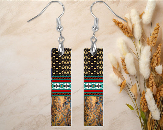 Western Aztec and Tooled Leather Print Bar Earrings, Printed Wood Dangle Earrings Hypoallergenic Jewelry Handmade