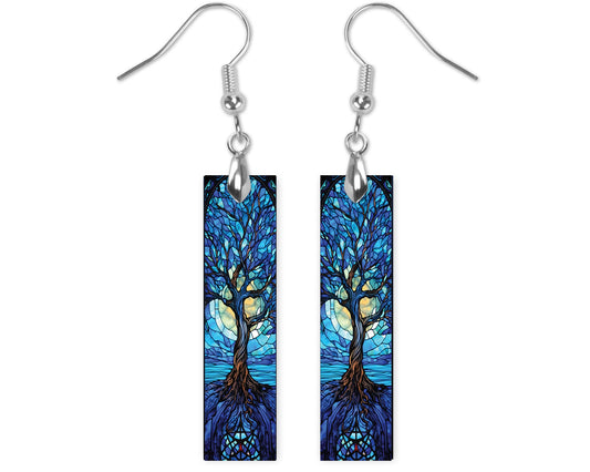 Blue Faux Stain Glass Tree Printed Wood Dangle Earrings Hypoallergenic Jewelry Handmade