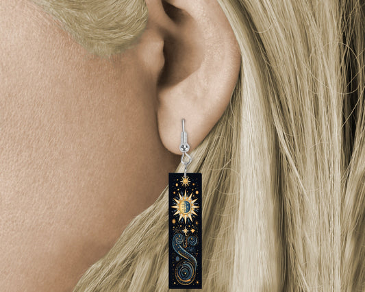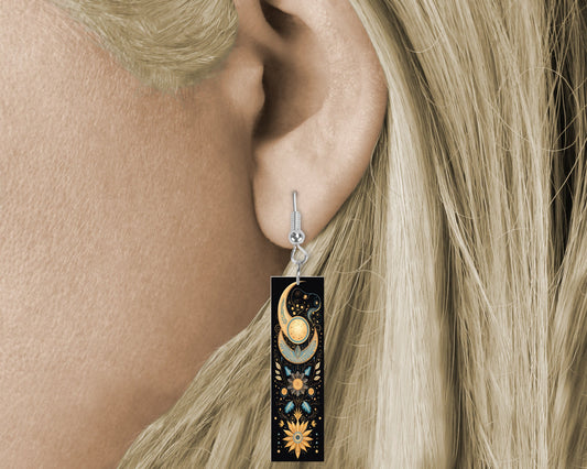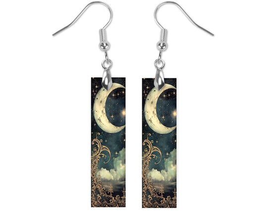 Crescent Moon Earrings, Printed Wood Dangle Earrings Hypoallergenic Jewelry Handmade