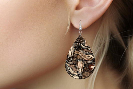 Western Cow Skull Print Earrings Print Tear Drop Wood Dangle Earrings Hypoallergenic Jewelry