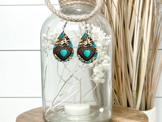Western Heart Print Earrings Print Tear Drop Wood Dangle Earrings Hypoallergenic Jewelry