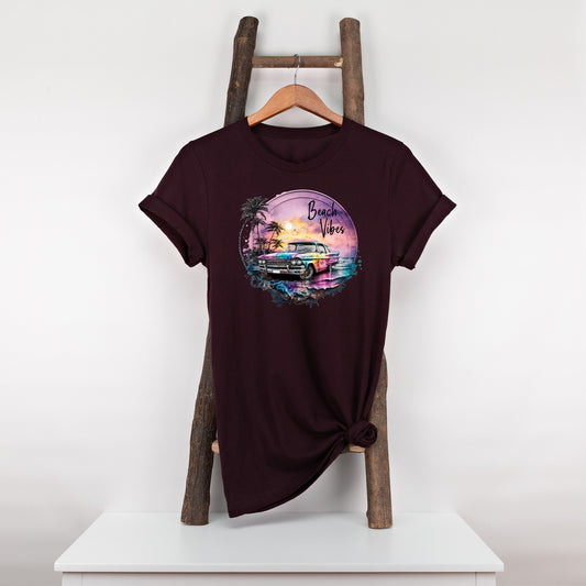 New Release, Beach Vibes Vintage Car T Shirt, Tshirt, Graphic T's 100% Cotton Black White or Gray, Tee,