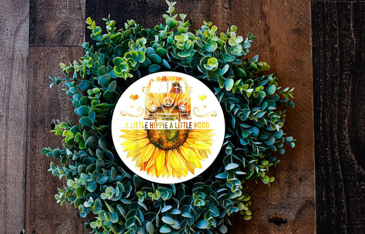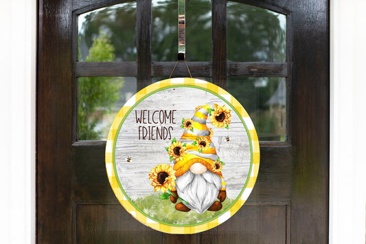 Letrero de madera hecho a mano con estampado redondo de gnomos de girasol de Welcome Friends