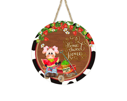 Sandía vaca hogar dulce hogar redondo impreso hecho a mano cartel de madera