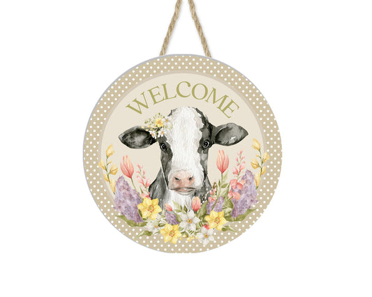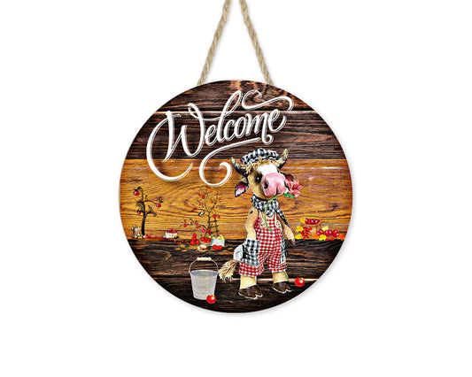 Letrero de madera hecho a mano con estampado redondo de vaca de bienvenida