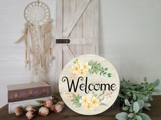 Letrero de madera hecho a mano con estampado redondo de bienvenida floral amarillo