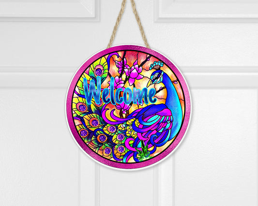 Letrero de madera hecho a mano con estampado redondo de bienvenida de pavo real brillante