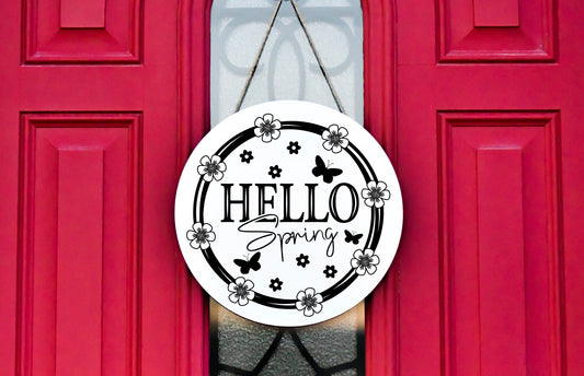 Letrero de madera hecho a mano con estampado redondo de Hola Primavera en blanco y negro, colgador de puerta, letrero de bienvenida