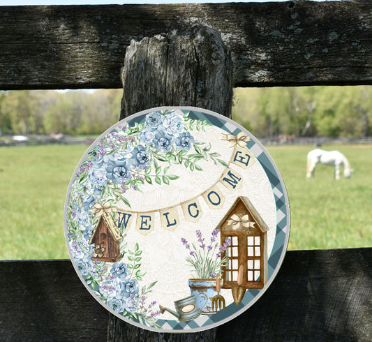 Letrero de madera hecho a mano con estampado redondo de bienvenida Floral azul, colgador de puerta, letrero de bienvenida