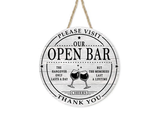 Colgador de puerta con letrero de madera hecho a mano impreso redondo de barra abierta